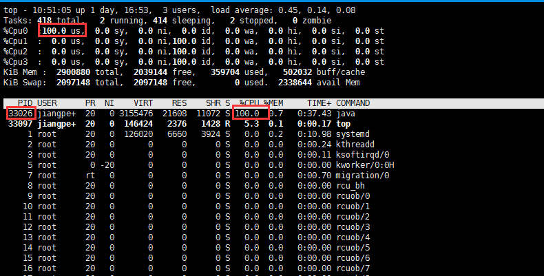 可以看到进程ID:33026的java进程占用cpu最多,基本霸占了一个cpu核心。