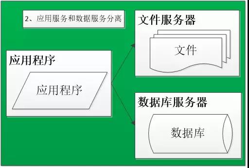 随着业务的扩展,一台服务器已经不能满足性能需求,故将应用程序、数据库、文件各自部署在独立的服务器上,并且根据服务器的用途配置不同的硬件,达到最佳的性能效果。
