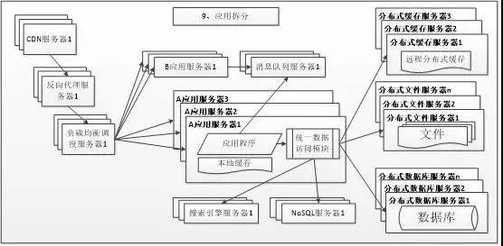 随着业务进一步扩展,应用程序变得非常臃肿,这时我们需要将应用程序进行业务拆分,如百度分为用户、商品、订单、图片等业务。每个业务应用负责相对独立的业务运作。业务之间通过消息进行通信或者同享数据库来实现。